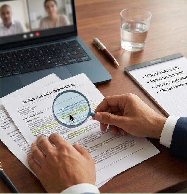 Der Besuch des MDK ist oft stressig. Ich trainiere mit Ihnen den Ablauf, erkläre die typischen Stolperfallen und zeige Ihnen, wie Sie Ihren Alltag authentisch und fachgerecht schildern. So gehen Sie mit Sicherheit und Ruhe in den Termin.